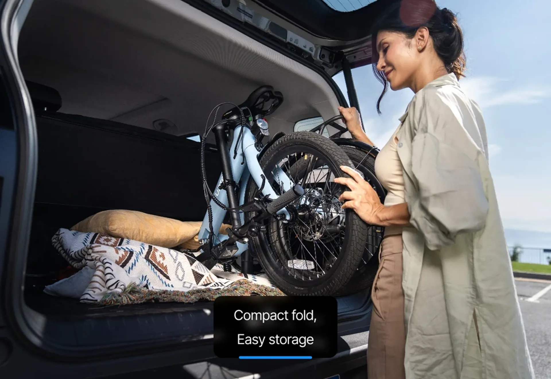 A design that doesn’t compromise the bike’s aesthetics, the seat post doubles as a removable battery. Simply fold the bike, place it in your car trunk, and take the lightweight seat post home for charging. Enjoy a convenient, easy lifestyle.